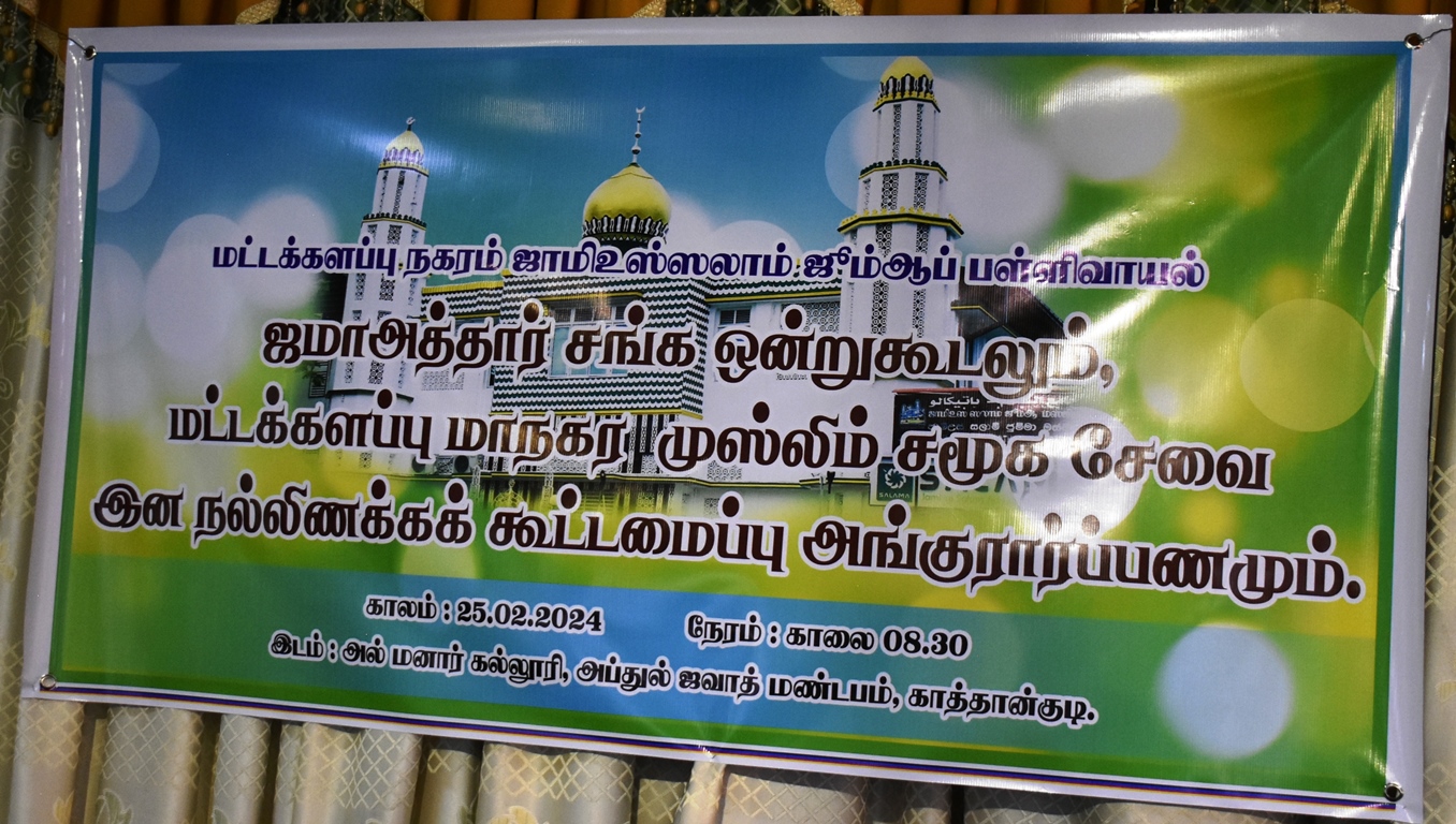 மட்டக்களப்பு மாநகர முஸ்லிம் சமூக சேவை இன நல்லிணக்க அமைப்பின் கூட்டமும் ஜும்மாப் பள்ளிவாசல் ஜமாஅத்தாரின் சங்க ஒன்று கூடலும் ஞாயிறன்று 25.02.2024 காத்தான்குடி அல்மனார் கல்லூரியில் இடம்பெற்றது.