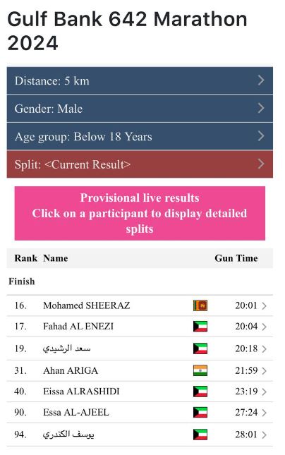 கடந்த சனிக்கிழமை (02.03.2024) “Gulf Bank-Kuwait” இனூடாக நடாத்தப்பட்ட ஆயிரத்துக்கும் அதிகமான ஓட்டப் போட்டியாளர்கள் கலந்து கொண்ட மரதன் ஓட்டப் போட்டியில் 18 வயதுக்கு கீழ் பிரிவில் குவைத்தில் கல்வி கற்கும் இலங்கை மாணவன் மொஹமட் ஷீராஸ் முதலாம் இடத்தை பெற்றுக்கொண்டுள்ளார். இலங்கை தர்கா நகரைச் சேர்ந்த மொஹமட் ஷீராஸ் மற்றும் திருமதி மஹ்ரூசா கலீல் தம்பதிகளின் புதல்வன் மொஹமட் ஷீராஸ் கல்வியிலும், விளையாட்டிலும் குவைத்தில் திறமை காட்டி வருகிறார். பாடசாலை மட்டங்களிலான பல்வேறுபட்ட தடகள போட்டிகளில் தங்கப் பதக்கங்களை வென்றுள்ளார்.