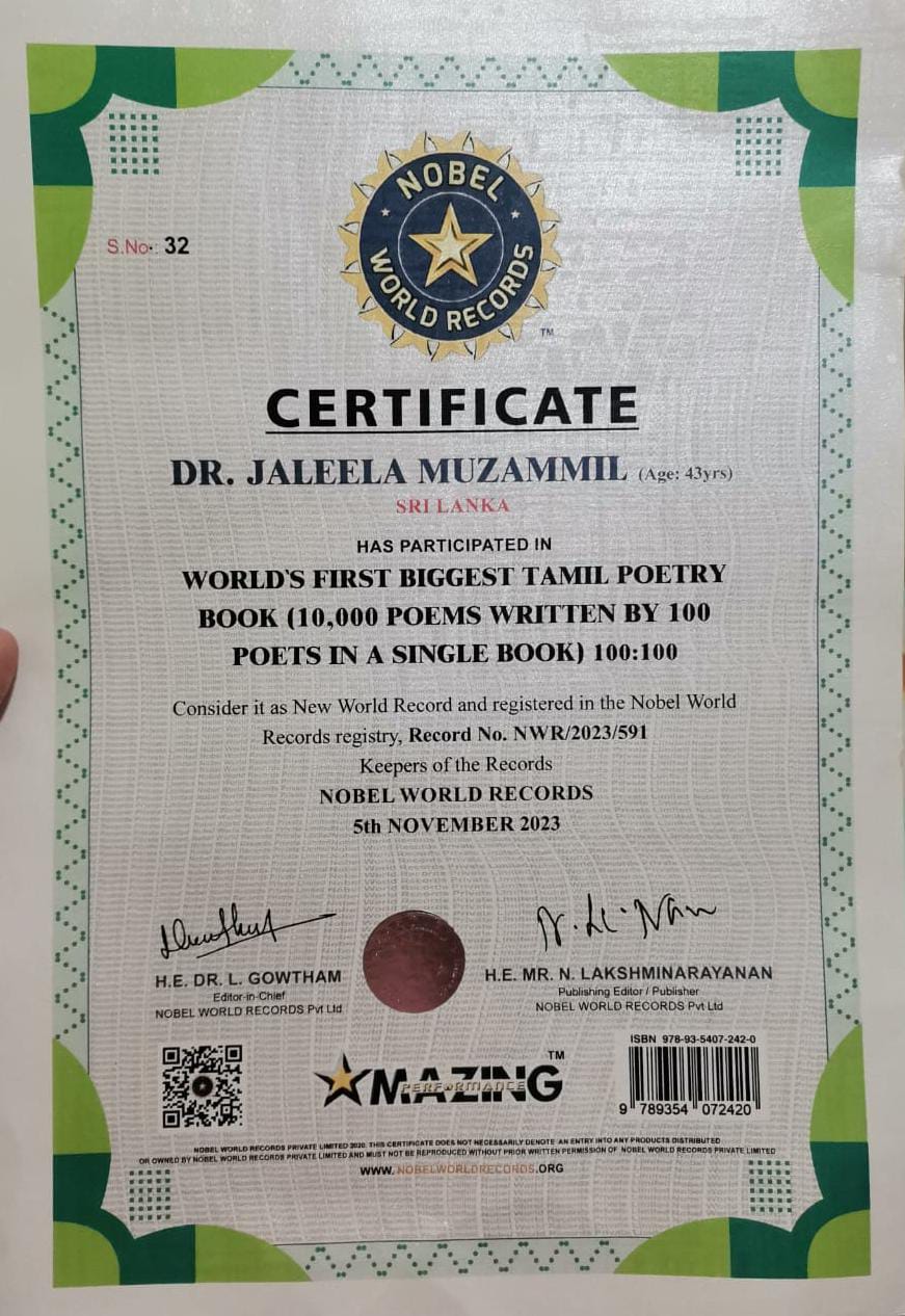 கவிஞர் என். ஜாகிர் உஷேன் தொகுப்பில் உருவான “கவித்தேனருவி” 10 ஆயிரம் கவிதைகளைக் கொண்ட “உலக சாதனை நூலில் கவிஞர் டாக்டர் ஜலீலா முஸம்மிலின் “துயில் நதிப் பூக்கள்” புதுக்கவிதை நூலும் தேர்வு