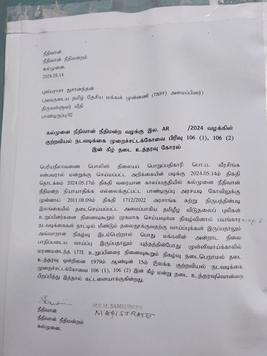 இதன் போது  கல்முனை பாண்டிருப்பு அரசடி அம்மன்  ஆலய முன்றலில் தமிழ் தேசிய மக்கள் முன்னணி கட்சி ஏற்பாட்டில்  அம்பாறை மாவட்ட வலிந்து காணாமல் ஆக்கப்பட்ட சங்கம்  பொதுமக்களுடன் இணைந்து   முள்ளிவாய்க்கால் கஞ்சி பரிமாறும் நிகழ்வினை முன்னெடுத்திருந்தது.எனினும் சம்பவ இடத்திற்கு வருகை தந்த பெரியநீலாவணை பொலிஸ் நிலையப் பொறுப்பதிகாரி பொலிஸ் பரிசோதகர் ஜே.எஸ்.கே.வீரசிங்க தலைமையிலான பொலிஸார் கல்முனை நீதிவான்  நீதிமன்ற தடை உத்தரவை காண்பித்து  தமிழ் தேசிய மக்கள் முன்னணி கட்சியின் மாவட்ட அமைப்பாளர் புஸ்பராஜ் துஷானந்தன் என்பவருக்கு தடை உத்தரவு உள்ளதாகவும் எனவே  முள்ளிவாய்க்காலில் படுகொலை செய்யப்பட்ட பொதுமக்களை நினைவுகூரும் முகமாக ஏற்பாடு செய்துள்ள  குறித்த நிகழ்வினை   நிறுத்துமாறு கூறி   தடை உத்தரவை வழங்கினர். அத்துடன் ஏனைய அம்பாறை மாவட்ட வலிந்து காணாமல் ஆக்கப்பட்ட சங்க தலைவி தம்பிராசா செல்வராணி  ஆகியோருக்கு பொலிஸாரினால் எச்சரிக்கை விடுக்கப்பட்டு அவ்விடத்தில் இருந்து செல்லுமாறு எச்சரித்தமை குறிப்பிடத்தக்கதாகும்.