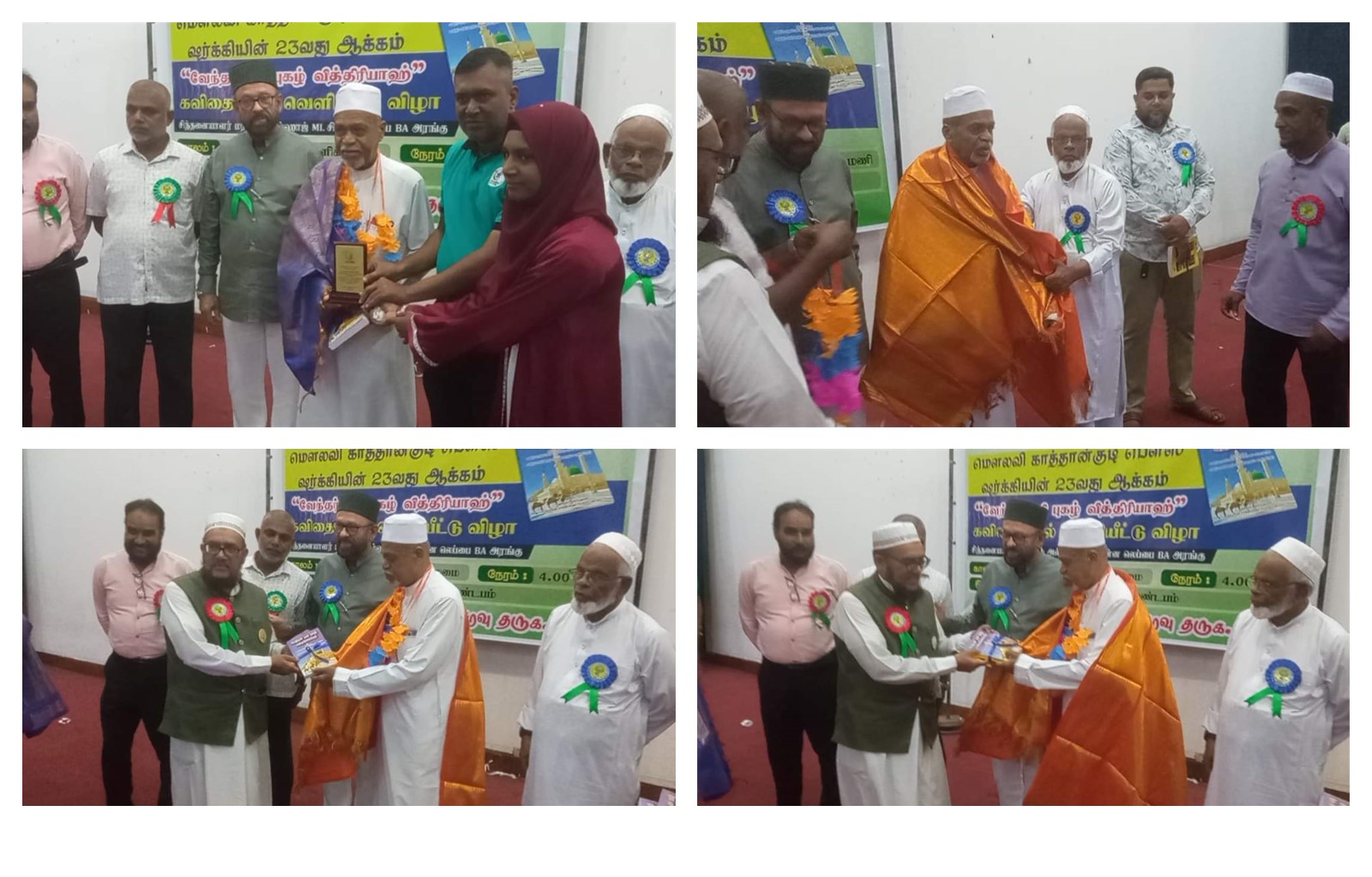 இதன் போது நூலாசிரியருக்கு. காத்தான்குடி ஆலோசனைக்கும் வழிகாட்டலுக்குமான ஆலிம்கள் அமைப்பினால் பொன்னாடை போர்த்தி நினைவுச் சின்னம் வழங்கி சமூக கவிஞர் என்ற பட்டமும் இதவழங்கப்பட்டு கெளரவிக்கப்பட்டார்.