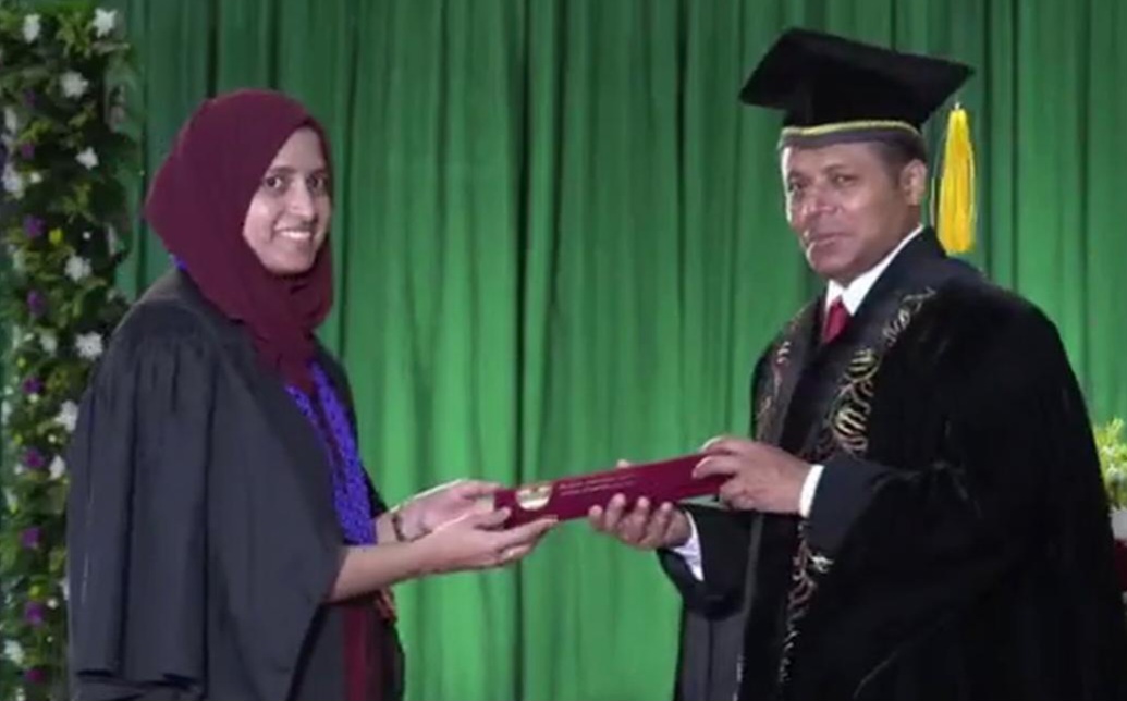 பேராதனை பல்கலைக்கழகத்தின் எண்பத்தைந்தாவது பொது பட்டமளிப்பு விழா-2023 பல்கலைக்கழக கேட்போர்கூடத்தில் அண்மையில் இடம்பெற்றது.பல்கலைக்கழக வைத்திய பீடத்தின் இறுதிப் பரீட்சையில் திறமைச் சித்தியடைந்த டாக்டர் சயிமா பானு உப வேந்தரிடமிருந்து தனது பட்டமளிபுக்கான விருதைப் பெற்றுக்கொண்டார்.