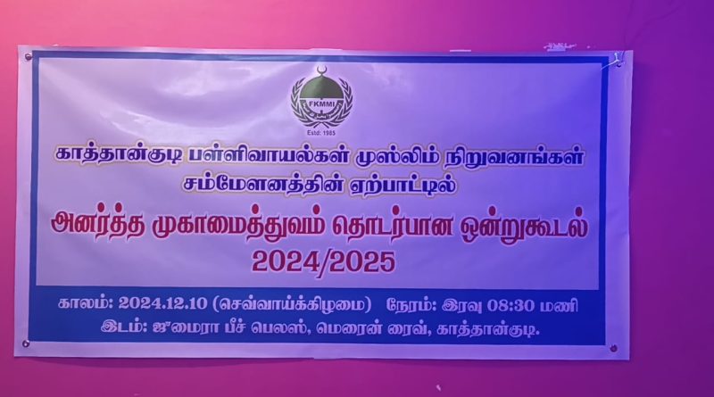 காத்தான்குடி பள்ளிவாயல்கள் முஸ்லிம் நிறுவனங்களின் சம்மேளனத்தின் ஏற்பாட்டில் காத்தான்குடி மற்றும் அண்மித்த பகுதிகளில் அனர்த்த நிலைமைகளின் போது களப்பணியாற்றும் சமூக நிறுவனங்கள் மற்றும் அமைப்புக்களை ஒன்றினைக்கும் நோக்கில் அனர்த்த முகாமைத்துவ ஒன்றுகூடல் செவ்வாய்க்கிழமை (10) ஜுமைரா பீச் பெலஸ் மண்டபத்தில் நடைபெற்றது.