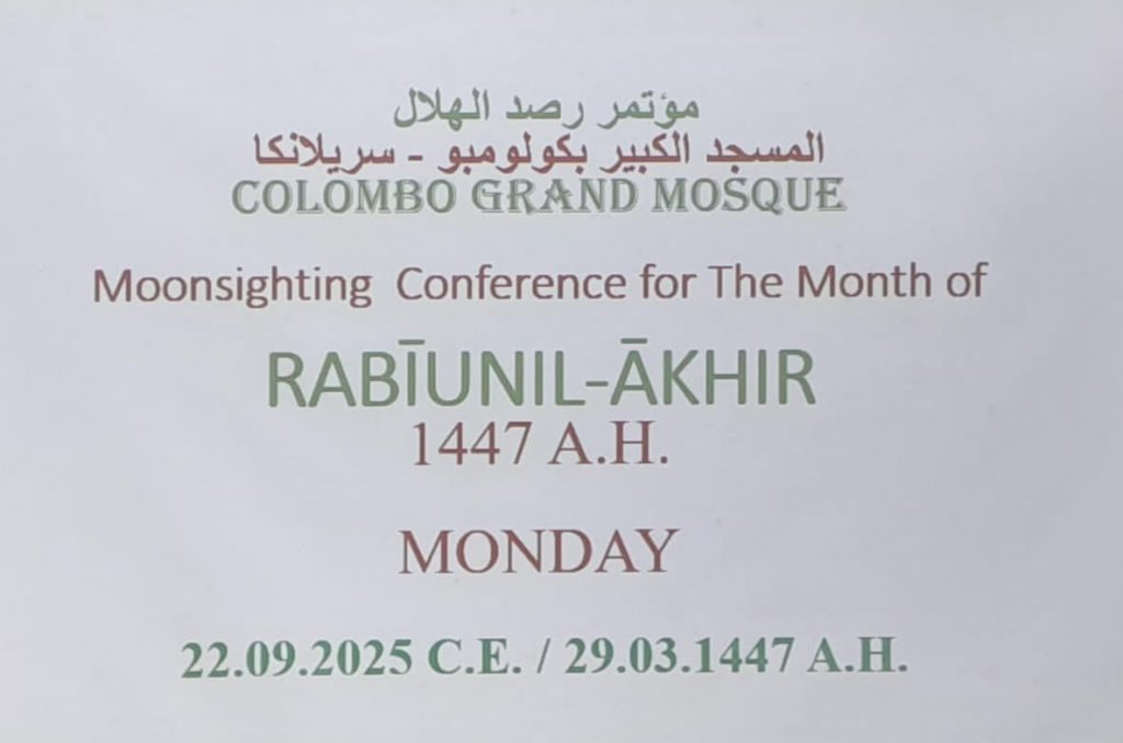 ஹிஜ்ரி 1447 ரபியுனில் ஆகிர் மாதத்திற்கான தலைப்பிறை பார்க்கும் மாநாடு நேற்று திங்கட்கிழமை (22) மாலை மஹ்ரிப் தொழுகையைத் தொடர்ந்து கொழும்பு பெரிய பள்ளிவாசலில் பிறைக்குழு தலைவர் அஸ்ஸெய்க் ஹிஸாம் அல் பத்தாஹி தலைமையில் இடம்பெற்றது.