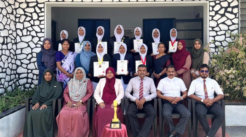 பெற்ற விருதுடன் அதிபர் எச். எல்.ஜிஃப்ரி,பிரதி அதிபர் எம்.எஸ்.எப்.இர்ஷானா,ரோஷான் ரஷீத்,ரஸா மல்ஹர்தீன் ஆகியோரோடு வெற்றி மாணவர்களும்,ஆசிரியர்களும் காணப்படுகின்றனர்.