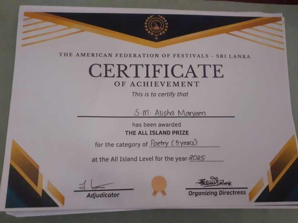 அமெரிக்காவை மையமாகக் கொண்டு இயங்கும் அமெரிக்கன் பெடரேசன் ஒப் பெஸ்டிவல்ஸ் நிறுவனத்தின் இலங்கைக் கிளை ஏற்பாடு செய்திருந்த ஆங்கில இலக்கிய போட்டி நிகழ்ச்சிகளில் 5 வயதிற்கு உட்பட்டவர்களுக்கான ஆங்கிலக் கவிதைப் போட்டியில் சப்னி மொஹம்மட் அலீஸா மர்யம் பங்கேற்று மாவட்ட மற்றும் மாகாண மட்டங்களில் முதலிடம் பெற்றிருந்தார்.
