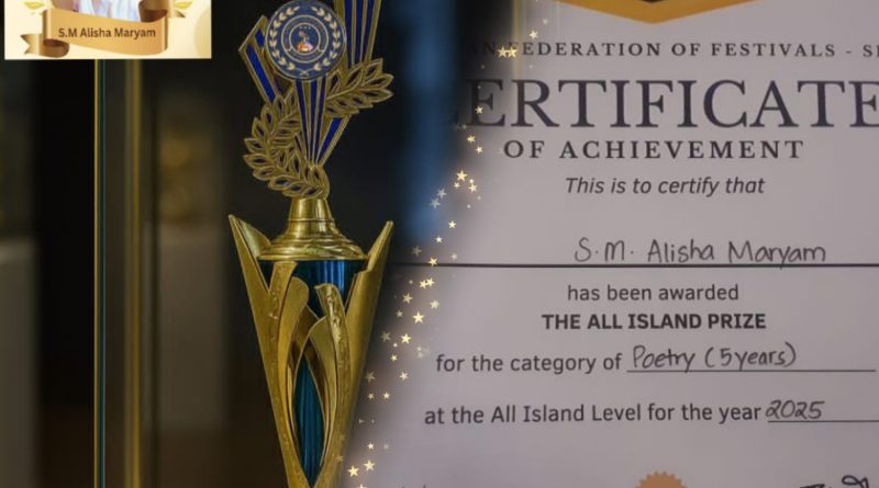 இந்நிலையில் கடந்த 12ஆம் திகதி கொழும்பில் இடம்பெற்ற அகில இலங்கை ரீதியிலான போட்டியில் மீண்டும் முதலிடத்தை தன் வசப்படுத்திக் கொண்ட சப்னி மொஹம்மட் அலீஸா மர்யம் 2025 ஆம் ஆண்டின் 5 வயதிற்குட்படோருக்கான ஆங்கிலக் கவிதைப் போட்டியின் சம்பியன் பட்டத்தினை தனதாக்கினார். மேலும் இவ் வெற்றிக்காக பெறுமதிமிக்க சான்றிதழும், சம்பியன் கிண்ணமும் அவருக்கு வழங்கப்பட்டமை குறிப்பிடத்தக்கது. அத்துடன் இவர் சட்டத்தரணி சப்ரி மொஹம்மட் சப்னி மொஹம்மடின் புதல்வி என்பதும் குறிப்பிடத்தக்கது.