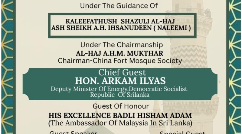 மாத்தறை மாவட்ட பாராளுமன்ற உறுப்பினரும் எரிசக்தி பிரதி அமைச்சருமான அர்கம் இல்யாஸ் பிரதம அதிதியாகவும் மலேசிய நாட்டின் இலங்கைத் தூதுவர் பத்லி ஹிஷாம் ஆதம் கௌரவ அதிதியாகவும் தேசபந்து டாக்டர் ரயீஸ் மீரா விஷேட அதிதியாகவும் சிறப்பு பேச்சாளராக மௌலவி எம்.எம்.அஸ்மீர் (ஹஸனி)யும் கலந்து கொள்வர்.