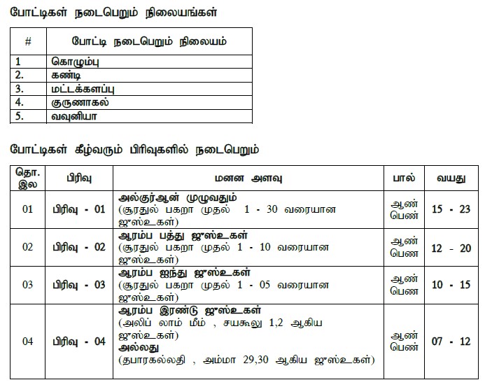 இப்போட்டிகள் முஸ்லிம் சமய பண்பாட்டலுவல்கள் திணைக்களத்தில் பதிவு செய்யப்பட்டுள்ள அரபுக் கல்லூரிகள், ஹிப்ழுல் குர்ஆன் மத்ரஸாக்கள் மற்றும் அரச பாடசாலைகள் அல்லது அரச அங்கீகாரம் பெற்ற தனியார் பாடசாலைகளில் கல்வி கற்கும் மாணவர்களை மையப்படுத்தி ஆண், பெண் இரு பாலாருக்கும் நான்கு பிரிவுகளாக நடாத்தப்படும். ஒவ்வொரு பிரிவிலும் வெற்றிபெறும் போட்டியாளர்கள் சவூதி அரசாங்கத்தினால் பெறுமதியான பரிசில்கள் வழங்கி கௌரவிக்கப்படுவர்.