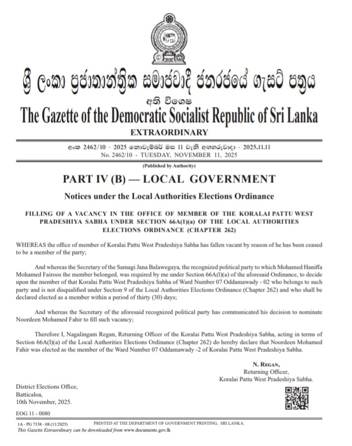 ஓட்டமாவடி பிரதேச சபை புதிய தவிசாளர் தெரிவு இம்மாதம் 20 ஆம் திகதி; என்.எம்.பாஹிர் புதிய உறுப்பினராக நியமனம்