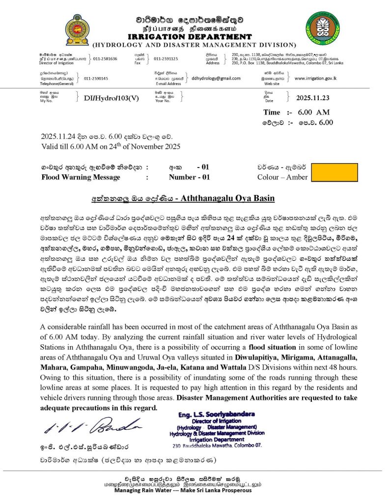 அத்தனகல்ல ஓயாவின் தற்போதைய மழை நிலைமை மற்றும் நீரியல் நிலையங்களின் (Hydrological Stations) ஆற்று நீர் மட்டங்களை பகுப்பாய்வு செய்கையில், அடுத்த 48 மணித்தியாலங்களுக்குள் பின்வரும் பிரதேச செயலாளர் பிரிவுகளில் அமைந்துள்ள அத்தனகலு ஓயா மற்றும் உருவல் ஓயா (Uruwal Oya) பள்ளத்தாக்குகளின் சில தாழ்வான பகுதிகளில் வெள்ள நிலைமை ஏற்படுவதற்கான சாத்தியக்கூறுகள் உள்ளன: