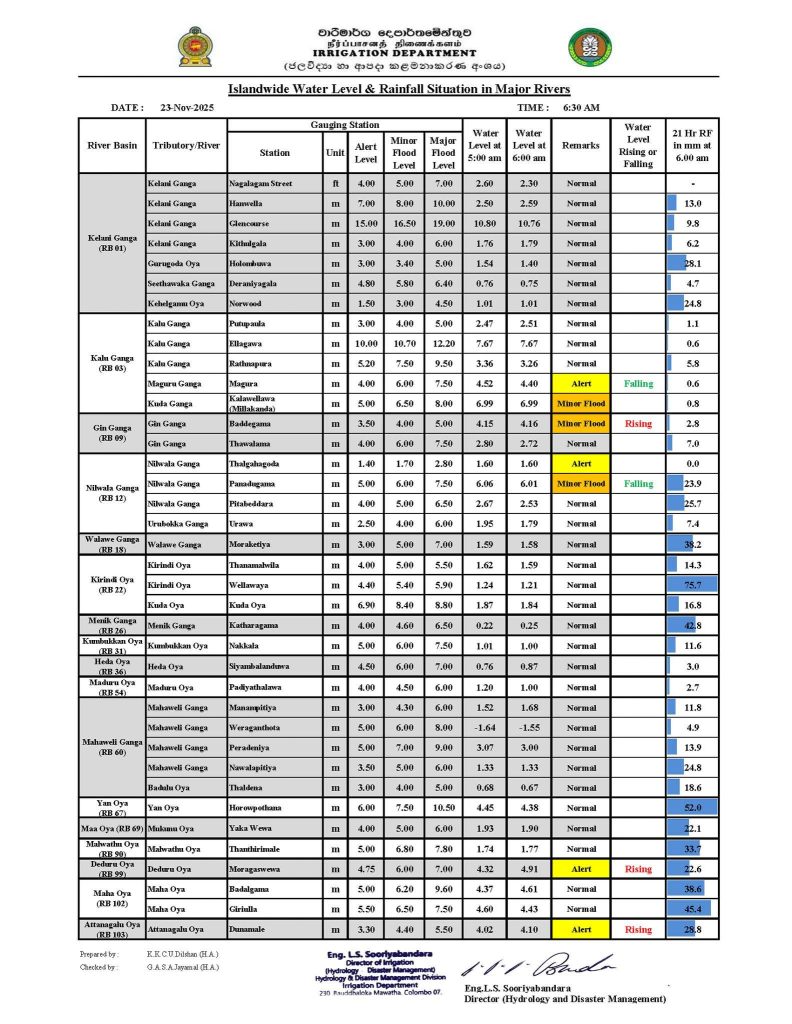 இன்று காலை 6.00 மணி நிலவரப்படி, அத்தனகலு ஓயா வடிநிலத்தின் (Attanagalu Oya Basin) பெரும்பாலான நீர்ப்பிடிப்பு பகுதிகளில் குறிப்பிடத்தக்க மழைவீழ்ச்சி பதிவாகியுள்ளது.