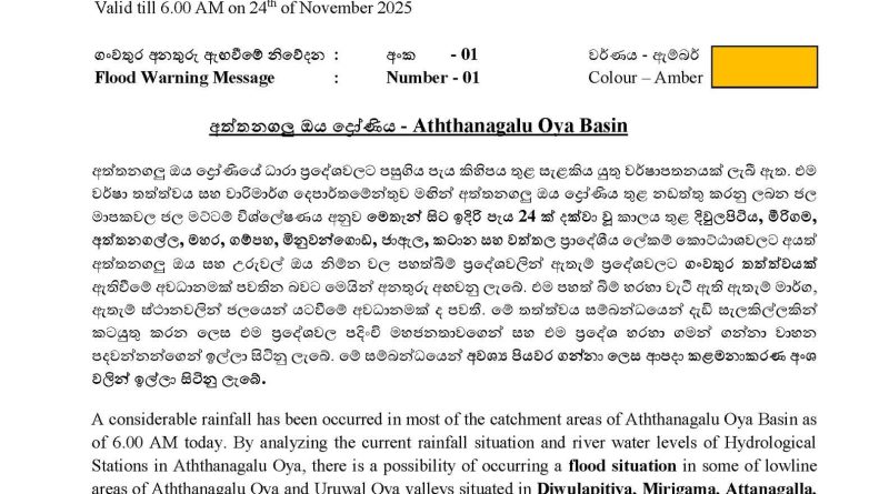 இன்று காலை 6.00 மணி நிலவரப்படி, அத்தனகலு ஓயா வடிநிலத்தின் (Attanagalu Oya Basin) பெரும்பாலான நீர்ப்பிடிப்பு பகுதிகளில் குறிப்பிடத்தக்க மழைவீழ்ச்சி பதிவாகியுள்ளது.