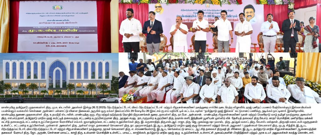 நங்கநல்லூரில் ஒரு ஏக்கர் அரசு நிலப்பரப்பில் 39 கோடியே 20 லட்சம் ரூபாய் மதிப்பீட்டில் புதிய தமிழ்நாடு ஹஜ் இல்லத்துக்கு முதல்வர் ர் மு.க.ஸ்டாலின் அடிக்கல் நாட்டினார்.