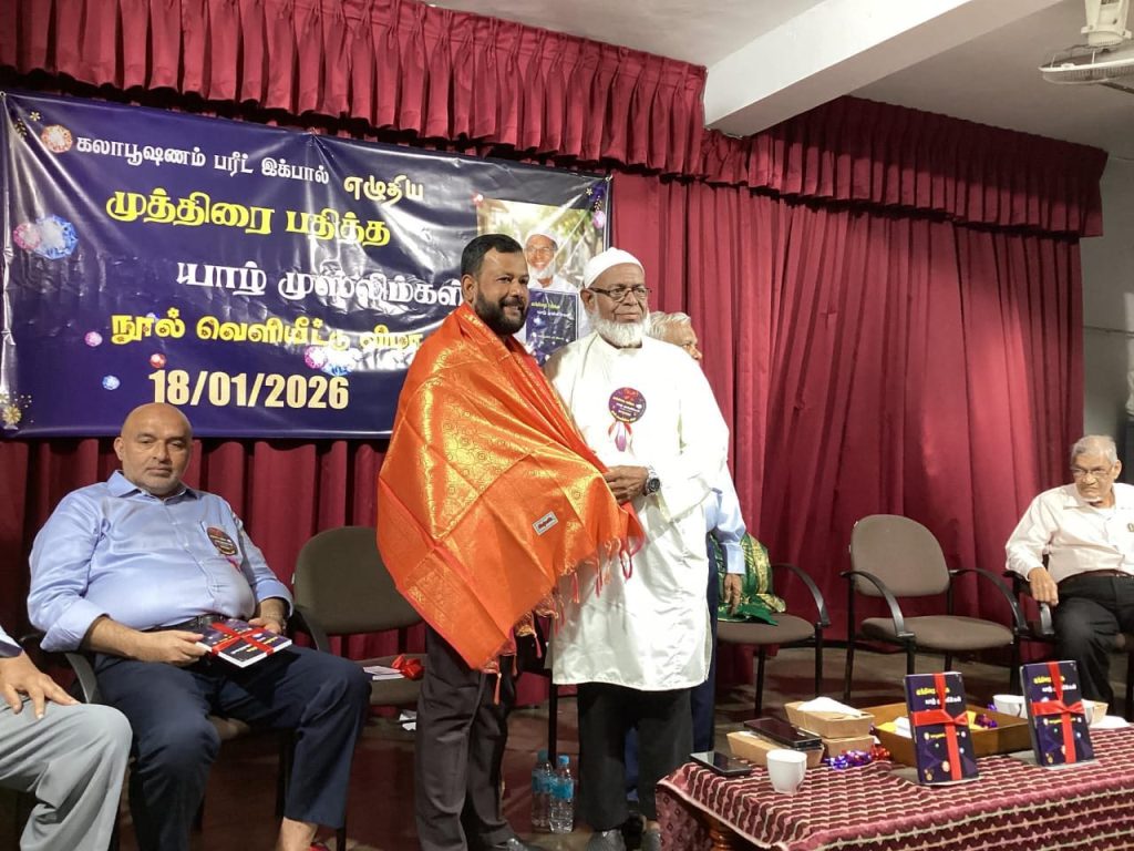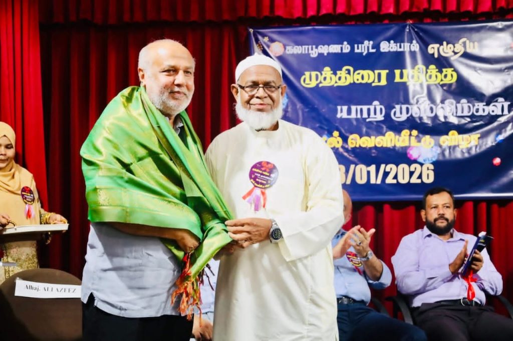 கலாபூஷணம் பரீட் இக்பால் எழுதிய முத்திரை பதித்த யாழ் முஸ்லிம்கள் நூல் வெளியீடு 18.01.2026 திகதி ஞாயிற்றுக்கிழமை மாலை கொழும்பு தமிழ்ச் சங்கம் மண்டபத்தில் ஓய்வுபெற்ற பிரதி கல்விப்பணிப்பாளர் அல்ஹாஜ் M.S.A.M. முஹுதார் அவர்களின் தலைமையிலும் Muzan International Chairman முஸ்லிம் ஸலாஹுத்தீன் அவர்களின் முன்னிலையிலும்