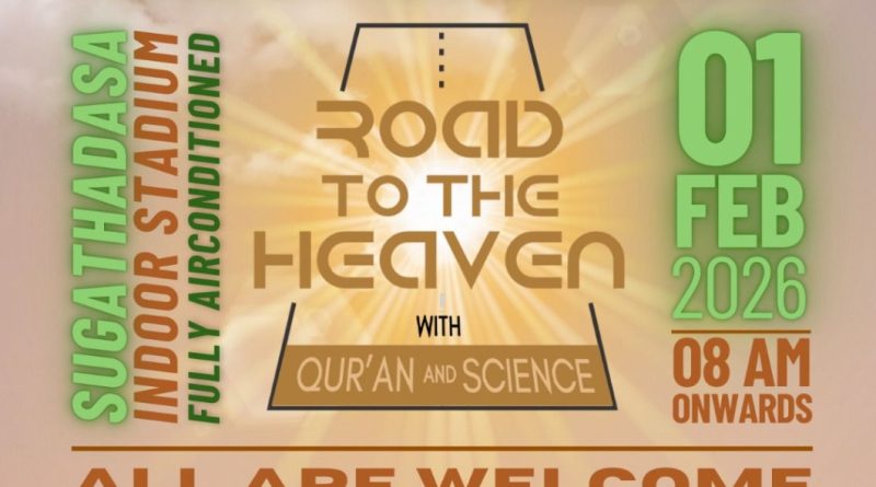 கொழும்பு, இலங்கை – புனித அல்குர்ஆனின் வழிகாட்டல்கள் மற்றும் அறிவியல் ரீதியான உண்மைகளை அடிப்படையாகக் கொண்டு, சமூகத்தில் ஒரு பாரிய ஒழுக்கவியல் மாற்றத்தை ஏற்படுத்தும் நோக்கில் சுவர்க்கத்தை நோக்கிய பாதை – குர்ஆனும் அறிவியலும் (Road to the Heaven – With Qur’an and Science) எனும் விசேட மாநாடு எதிர்வரும் 2026 பெப்ரவரி 01 ஆம் திகதி கொழும்பு சுகததாச உள்ளரங்கத்தில் நடைபெறவுள்ளது.