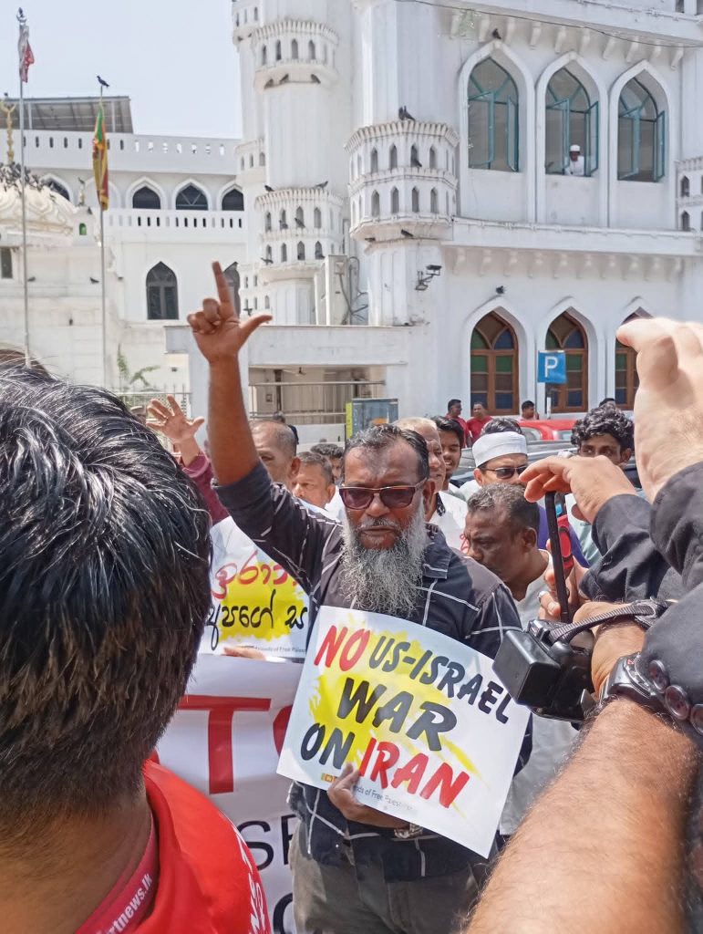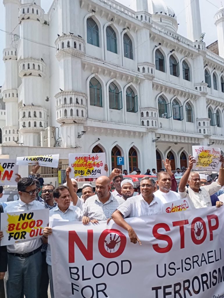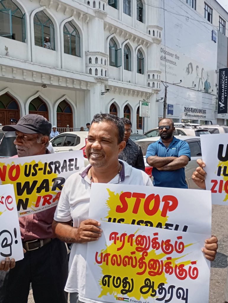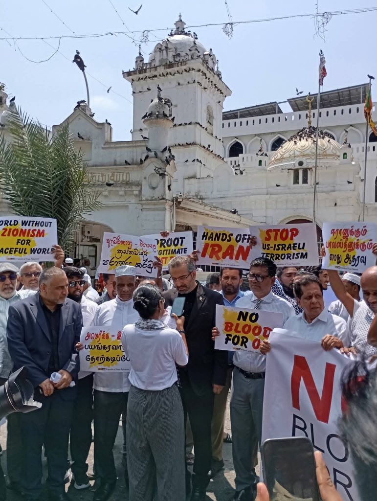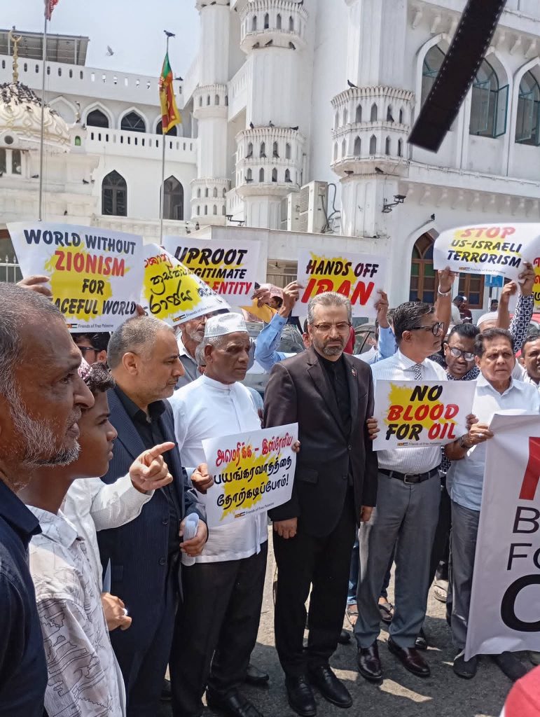 அமெரிக்க இஸ்ரேலிய போர் வெறிக்கு எதிராக இன்று (06) வெள்ளிக்கிழமை கொழும்பில் எதிர்ப்பு ஆர்ப்பாட்டம் நடைபெற்றுள்ளது. இதில் இலங்கைக்கான ஈரானியத் தூதுவர், அரசியல்வாதிகள், சமூகர் ஆர்வலர்கள் என பலர் பங்கேற்றுள்ளனர்.