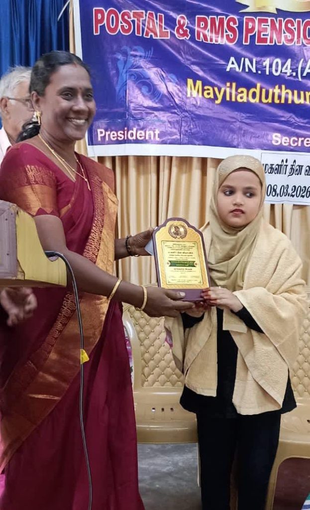 2026 ஆம் ஆண்டுக்கான மகளிர் தின விழாவில் கலந்துகொண்டு சிறப்புரை வழங்கிய, இந்தியா – தமிழ்நாடு, கரூர் – பள்ளப்பட்டி யைச் சேர்ந்த கவி கற்பக விருட்ச விருது பெற்ற குட்டிப் பெண் ஆளுமை இளங்கவி செல்வி அ.ம. உம்மு ஹானி புஷ்ரா, செந்தமிழ் அருவி என்ற விருது வழங்கி கௌரவிக்கப்பட்டார்.