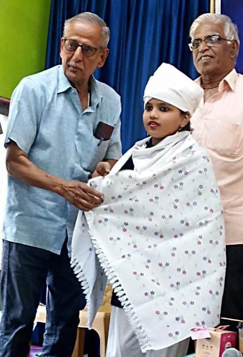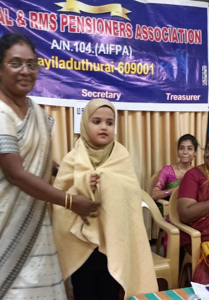 மயிலாடுதுறை மாவட்ட அஞ்சல் மற்றும் ஆர்.எம்.எஸ். ஓய்வூதியர் சங்கம், இம்மாணவியின் திறமையைப் பாராட்டி, மயிலாடுதுறை – வருவாய்த்துறை ஊழியர் சங்கக் கட்டிட வரவேற்பு மண்டபத்தில் அண்மையில் இடம்பெற்ற மாபெரும் சிறப்பு விருது வழங்கல் விழா நிகழ்வின்போது, இவருக்கு செந்தமிழ் அருவி விருது, நினைவுச் சின்னம் மற்றும் சான்றிதழ் என்பனவற்றை வழங்கி பாராட்டி கௌரவித்தது.