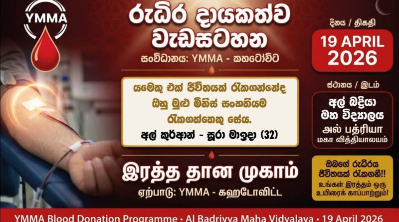 கஹட்டோவிட்ட வை.எம்.எம்.ஏ கிளை ஏற்பாட்டில் நாளை இரத்த தான முகாம்